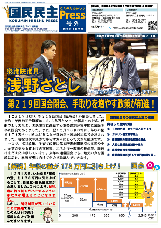 活動Letter 2025年11月・12月号(第219回国会閉会、手取りを増やす政策が前進!)(2025.12.23)